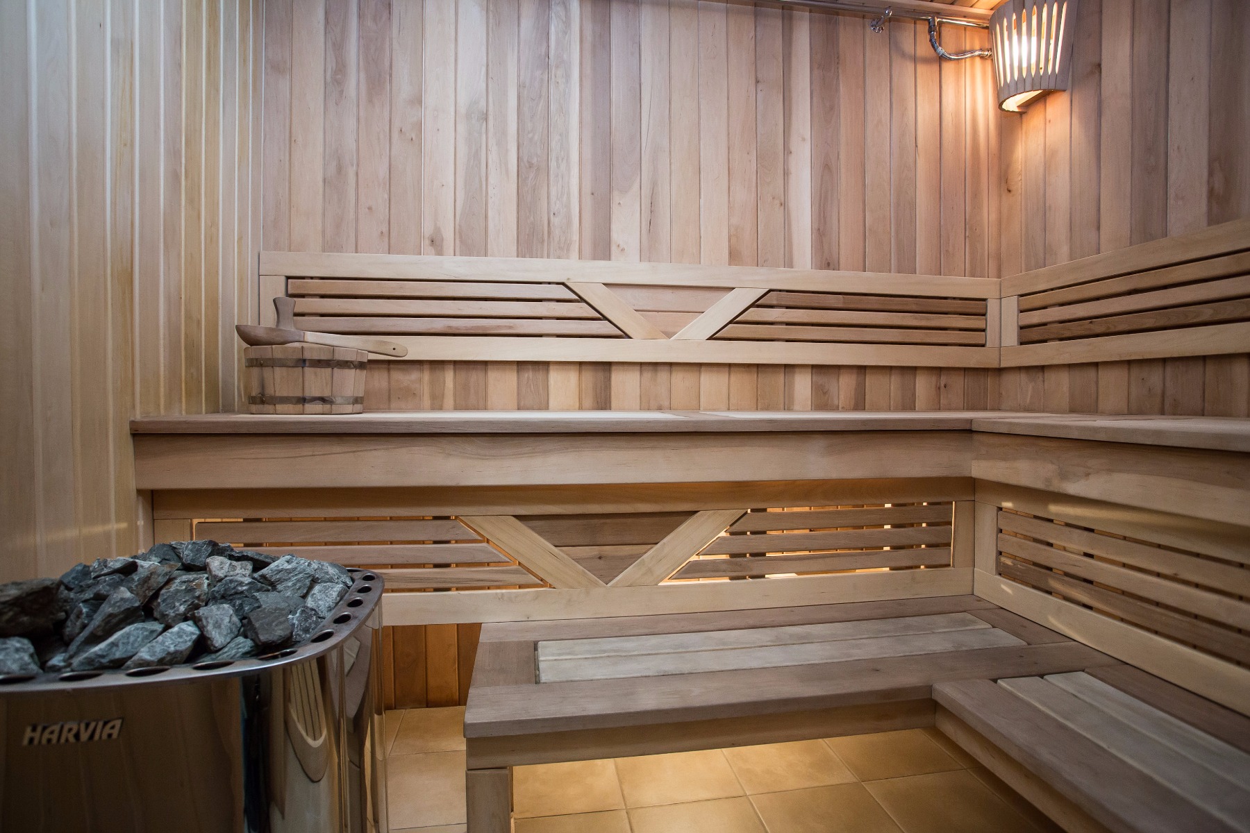 Финская сауна - это деревянная комната с деревянными полками на стене и каменкой из камня переодит. Прогревается финская баня от 70 до 100 градусов термостатом или дровами. В наших саунах стабильная температура 90 градусов. Отличается финская баня от русской тем, что влажность воздуха в ней 10-15% и сухой пар переносится намного легче чем при большой влажности.